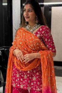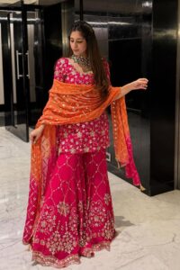 Embroidered Pink Sharara Suit with Orange Dupatta