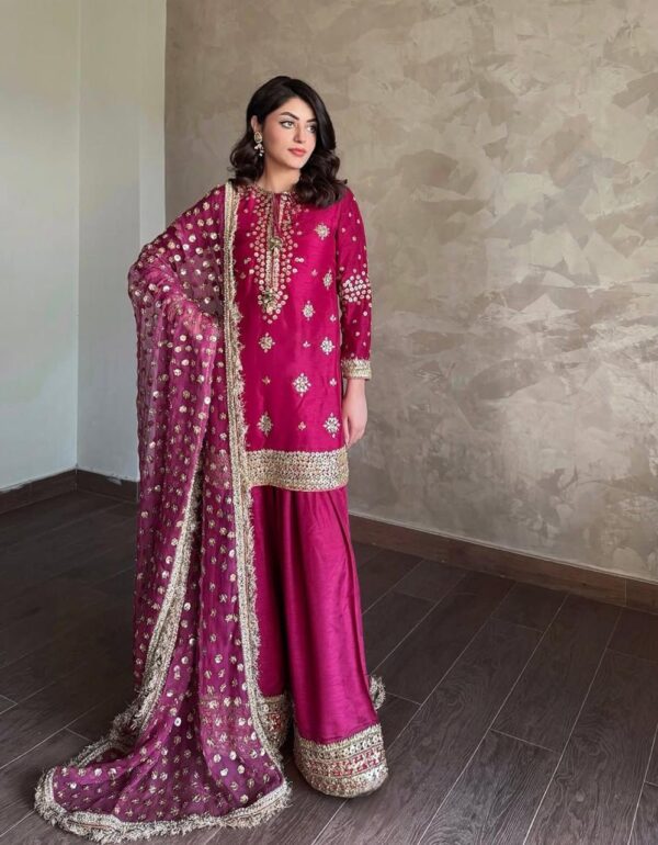 Kurti:• Fabric: Chinon silk• Inner: Micro• Work: Zari and 5mm sequins embroidery work• Length: 37-38 inches Plazzo:• Fabric: Chinon silk•