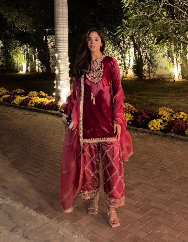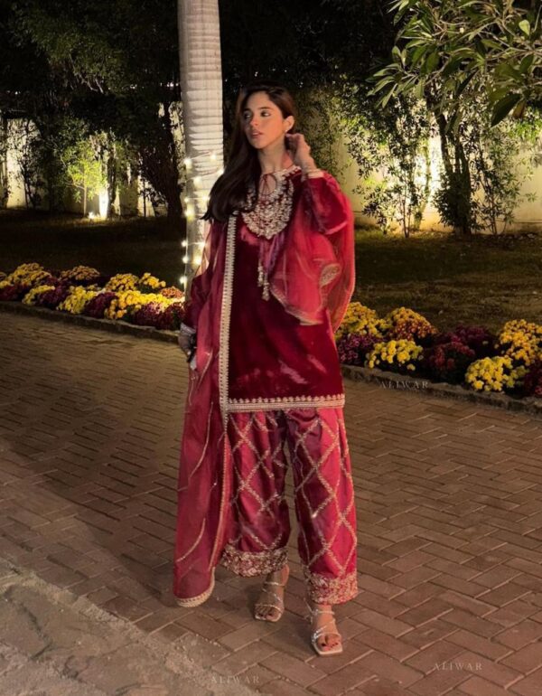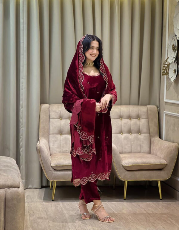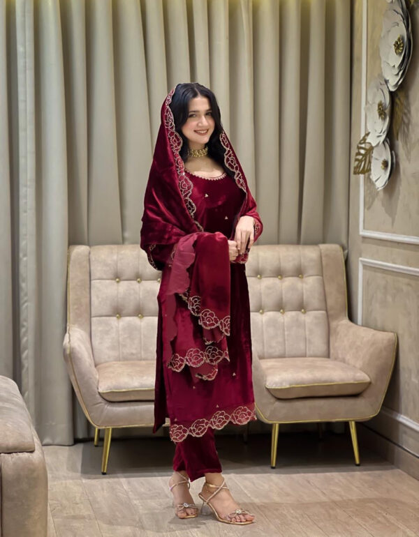 Experience luxurious warmth and elegance with this winter-season velvet designer kurta–pant set, beautifully adorned with intricate embroidery work. Fabric