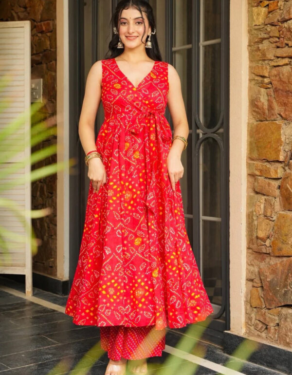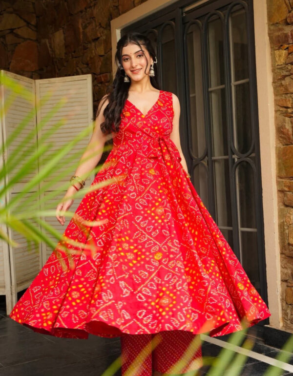 Radiate timeless elegance in our Crimson Bloom Bandhani Anarkali Set. This enchanting ensemble is a celebration of heritage craftsmanship, rendered