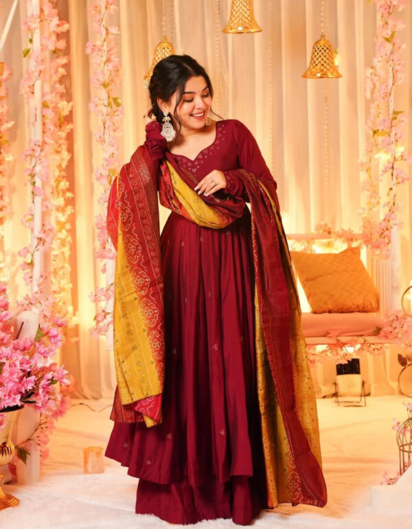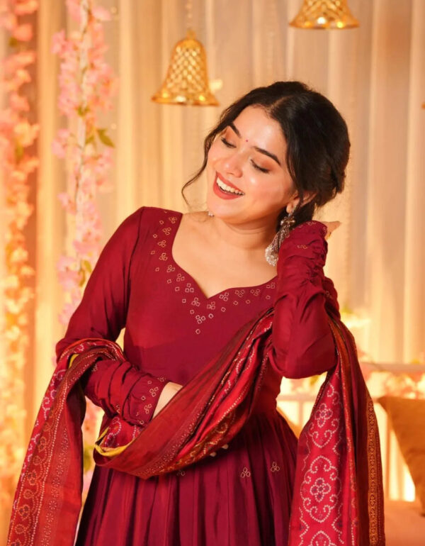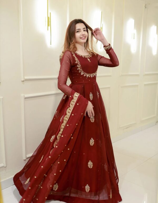 Radiate elegance in our Crimson Royale Anarkali, a breathtaking creation in rich maroon chiffon. This flowing silhouette is adorned with