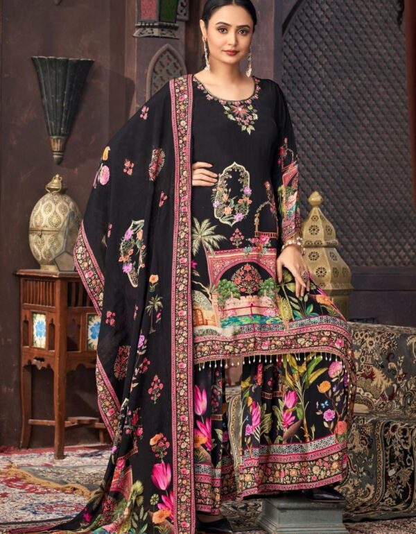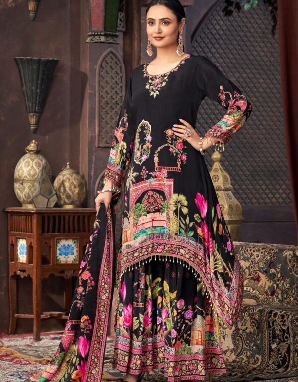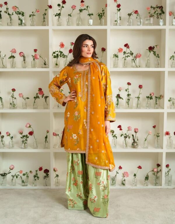 Top DetailsCrafted from high-quality heavy Chinon fabric, the top features exquisite embroidery combined with digital print detailing. Fully stitched with