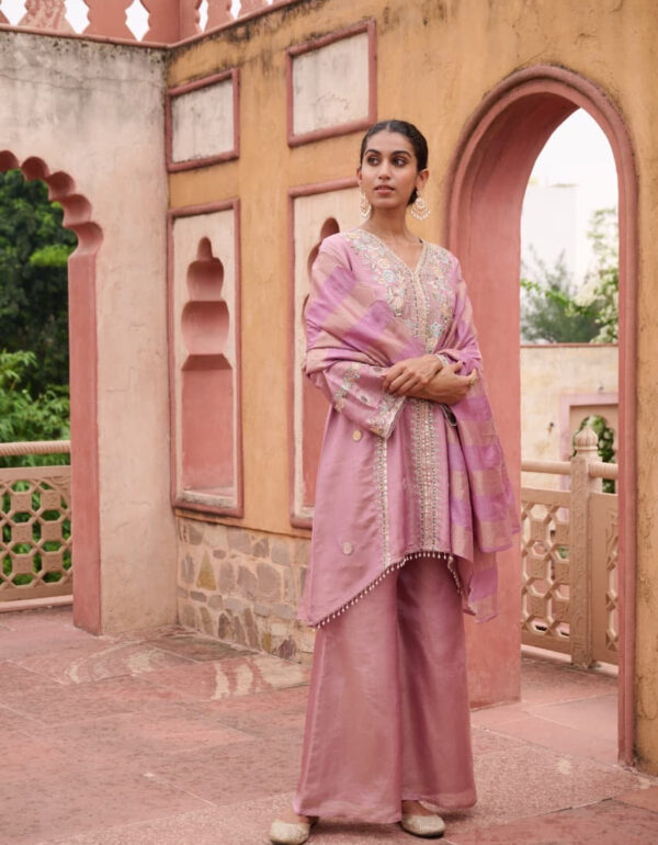 Set Includes: Kurta, Palazzo, and Dupatta Fabric: Shimmer Work: Exquisite Handcrafted Detailing Shipping: Orders are processed and delivered