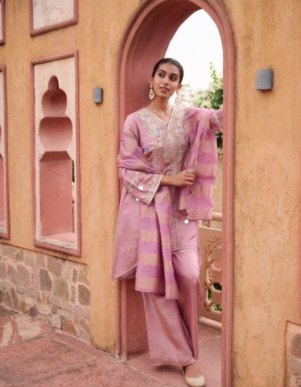 Kurta• Fabric: Pure Vichitra Silk• Length: 50–51 inches• Sleeves: 22″ Chudi-style (full-length)• Fit: Straight cut – Fully stitched Palazzo• Fabric: