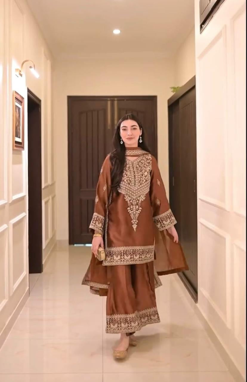 Introducing the Caramel Royale Silk Ensemble: a refined party wear outfit crafted from premium pur chinon silk, radiating warmth and sophistication with its striking caramel hue. The fully stitched top features delicate embroidery across the front, sleeves adorned with graceful tassels, and a micro cotton inner for maximum comfort. The matching palazzo, also in pur chinon silk with embroidery, presents an elongated silhouette and relaxed fit enhanced by an elasticized waist and micro cotton lining. Completing the set is a luxurious dupatta, edged with four-sided embroidered lace for an elevated finish, perfect for festive occasions or upscale gatherings.