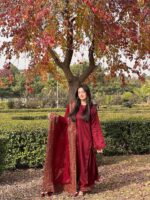 - Fabric: Heavy natural crepe silk with micro cotton lining, elasticated waist, and embroidery work
