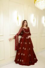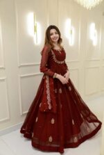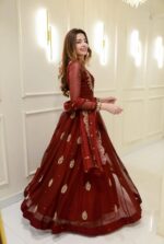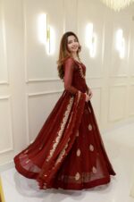 Radiate elegance in our Crimson Royale Anarkali, a breathtaking creation in rich maroon chiffon. This flowing silhouette is adorned with delicate zardosi hand embroidery, featuring intricate gold motifs scattered gracefully across the flare.