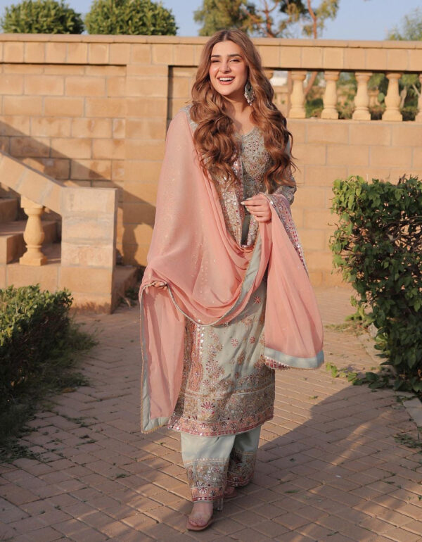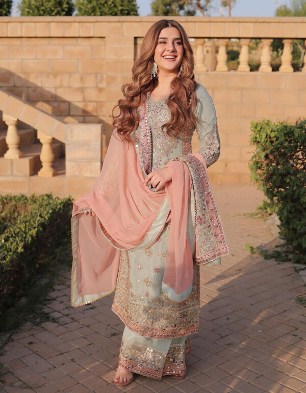 Fabric and details• Top fabric: Heavy faux georgette with heavy embroidery and sequin work.• Top inner: Heavy micro cotton.• Top