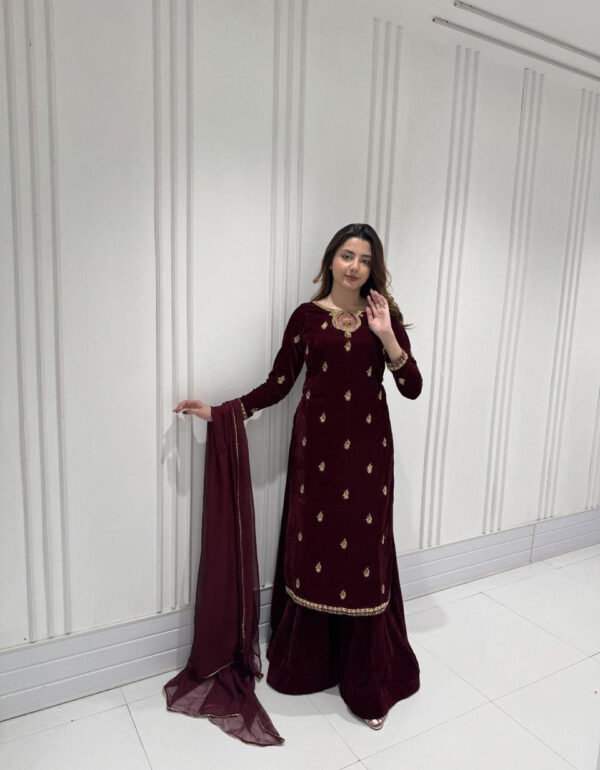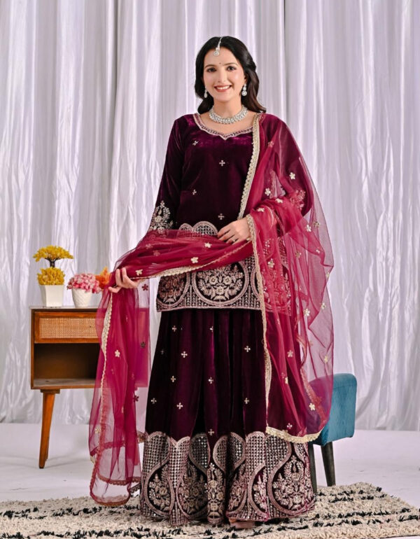 Launching a new designer party-wear sharara set featuring a rich maroon pure heavy viscose velvet top, sharara palazzo, and net