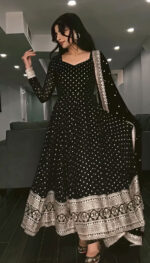 Step into a world of timeless elegance with our Ethereal Noir Anarkali Set. This exquisite ensemble is a masterpiece of design, crafted for the modern woman who cherishes tradition. The deep black canvas is adorned with a constellation of shimmering silver embellishments that dance with every movement, creating a captivating spectacle of light and shadow. The Anarkali’s generous flare and floor-grazing length evoke a sense of regal grace, making it the perfect choice for festive celebrations, weddings, and grand evening soirees.