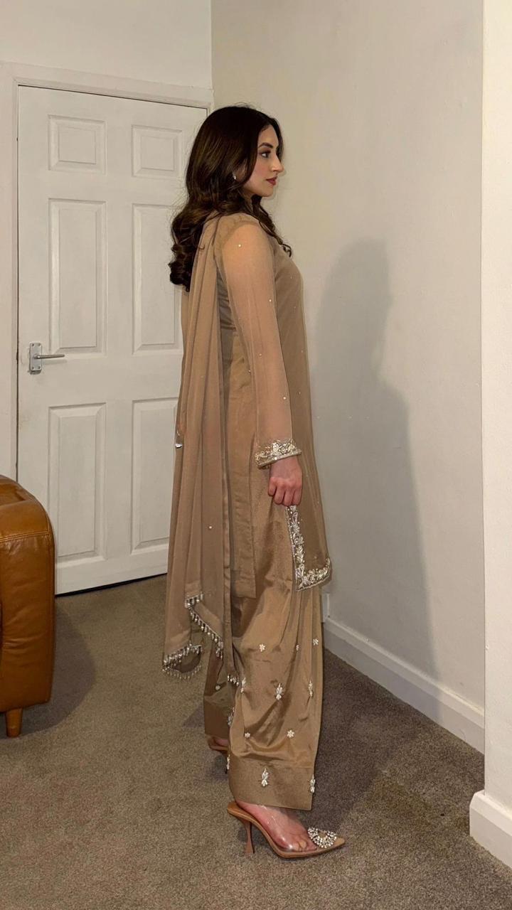 - Fabric: Premium georgette with embroidery, full sleeves, and bead work