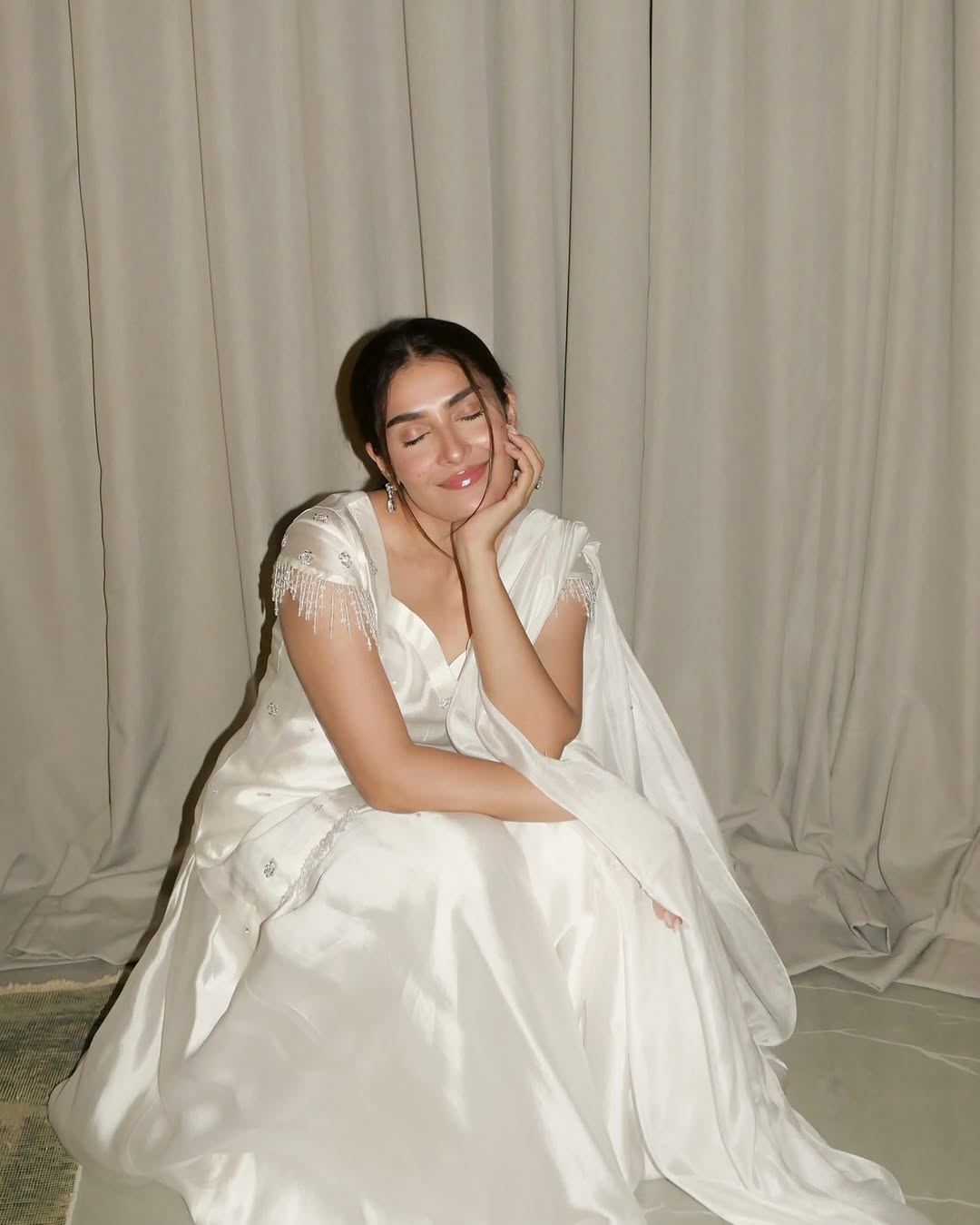 Flowing Dupatta: A matching, sheer white dupatta is elegantly draped over one shoulder, cascading down like a contemporary cape. This versatile piece features similar delicate sparkle, enhancing the ensemble’s dreamlike and pristine quality.