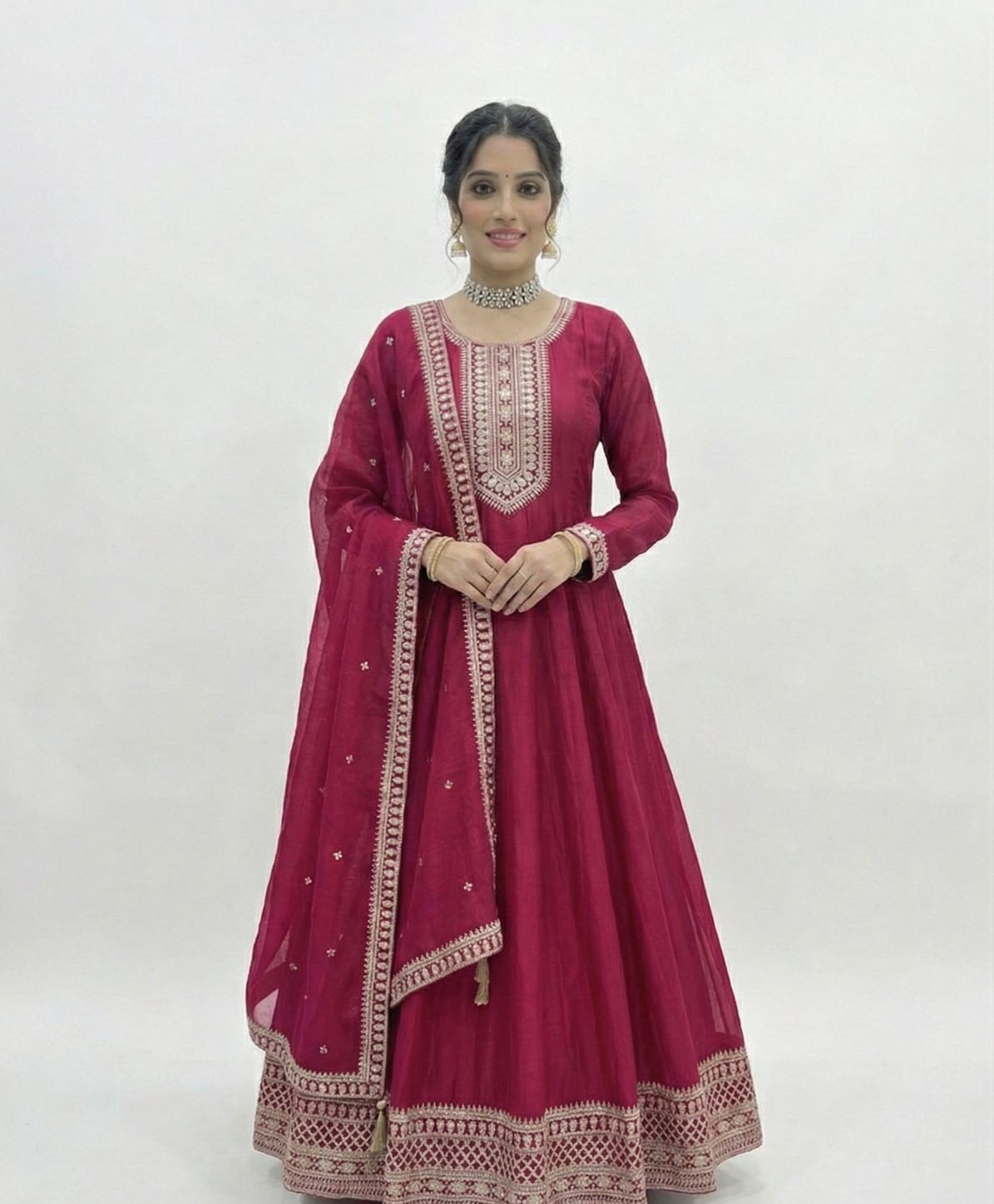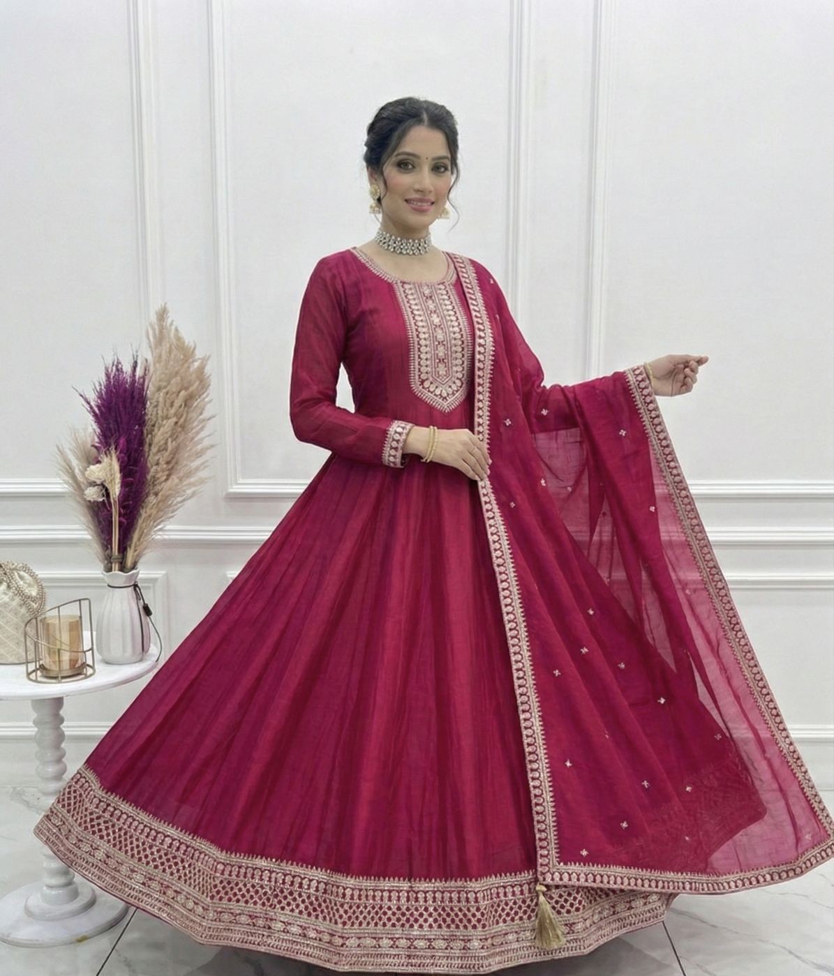 With its vibrant dark pink shade, rich fabric, and detailed craftsmanship, this Anarkali gown set is ideal for weddings, festive occasions, engagement ceremonies, family functions, and traditional celebrations. The fully stitched, ready-to-wear design ensures you can dress up effortlessly while making a striking style statement.