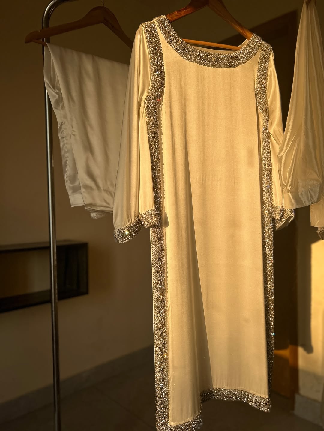 TOP Fabric: Heavy French silk Work: Beautiful embroidery and sequence work with riveted moti (front side only)