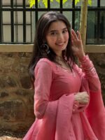 Gown: • Fabric: Crunchy silk with embroidery sequence work and full flare • Sleeves: Full • Inner: Heavy micro cotton