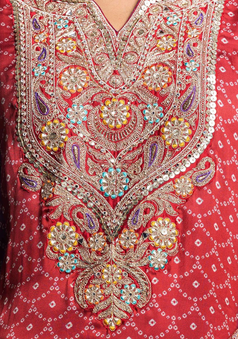 - Kameez: Stylish round-neckline with intricate thread work. Red printed body, mirror, and gota work on the borders.