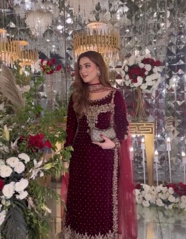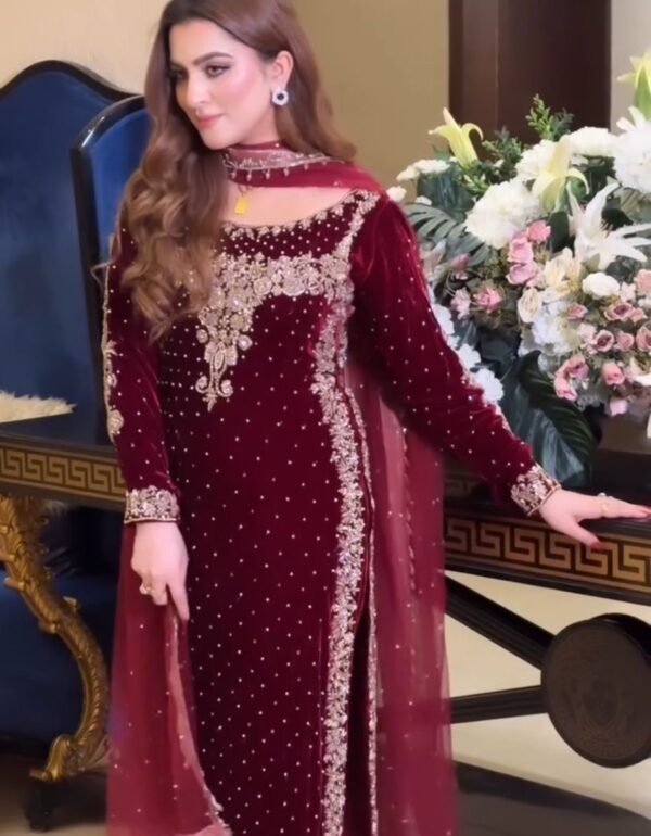 | Dupatta | Contrasting Crimson/Red dupatta with matching gold borders |