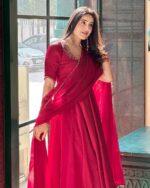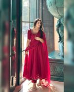 Introducing an embodiment of grace and elegance, this ready-to-wear Gown Set is a perfect addition to your luxury ethnic collection. Crafted from lustrous Heavy Fendy Silk, this ensemble is adorned with delicate Val Moti (pearl bead) work, adding a touch of timeless sophistication. The gown is designed with an impressive 7-meter flair that creates a stunning, regal silhouette, making it an ideal choice for festive events, weddings, and grand celebrations.