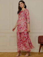 The palazzo is tailored in heavy dhamal jari fabric with coordinated digital prints and a micro cotton inner, offering fluid movement and effortless elegance. Its flowy design balances style and comfort, making it ideal for celebrations and special occasions.