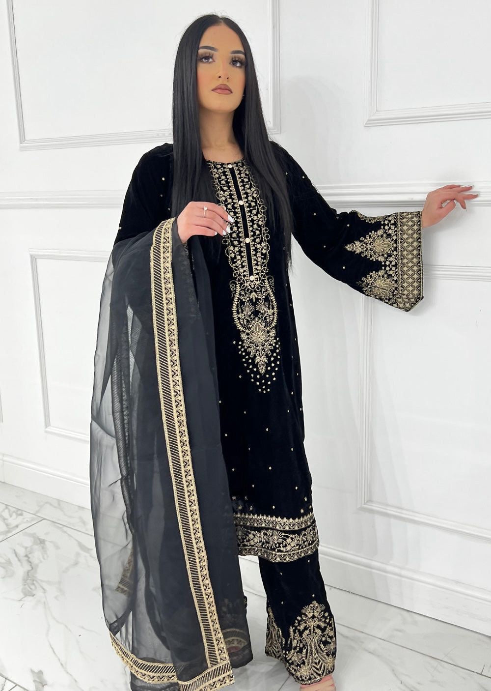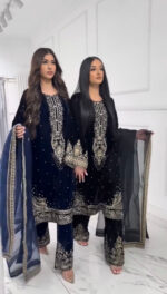 Top Fabric: Heavy Pure Viscose Velvet with Embroidery and 5 mm Sequin Work, Fancy Bell Sleeves
