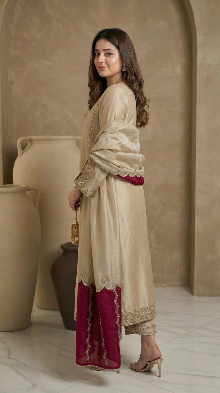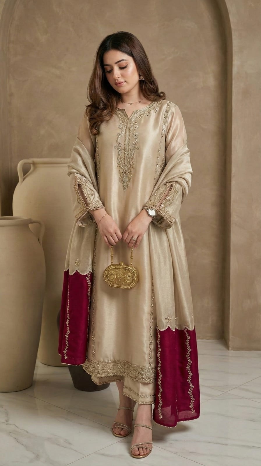 Step out in style with this graceful 3-piece ensemble, expertly crafted from flowy, premium Chinon. This set is designed to offer a perfect blend of festive glamour and lightweight comfort.