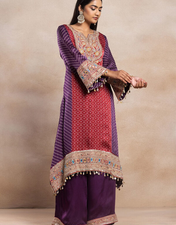 Red And Purple Bandhani Print Kurta Set With Palazzo And Dupatta