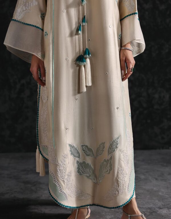 Leafy mint green organza appliqué embroidery adding depth, texture, and artisanal elegance