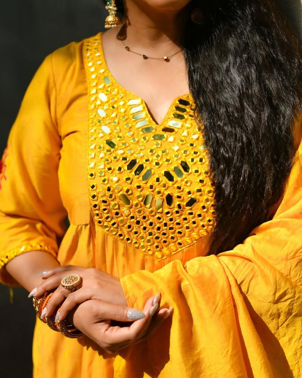 Introducing the Sunlit Mirror Muse Kurti Set, crafted for celebrations and elegant evenings with its flared silhouette and luminous artistry. The kurti dazzles in rich yellow fabric, adorned with exquisite mirror work and detailed embroidery across the neckline, bodice, and sleeves for a truly regal effect. Complemented by a matching pant that maintains the chic and graceful allure, the set includes a harmonious dupatta for the perfect finish. Designed for both comfort and opulence, this ensemble is a highlight for weddings, festivals, and luxe gatherings.