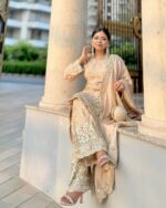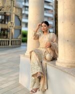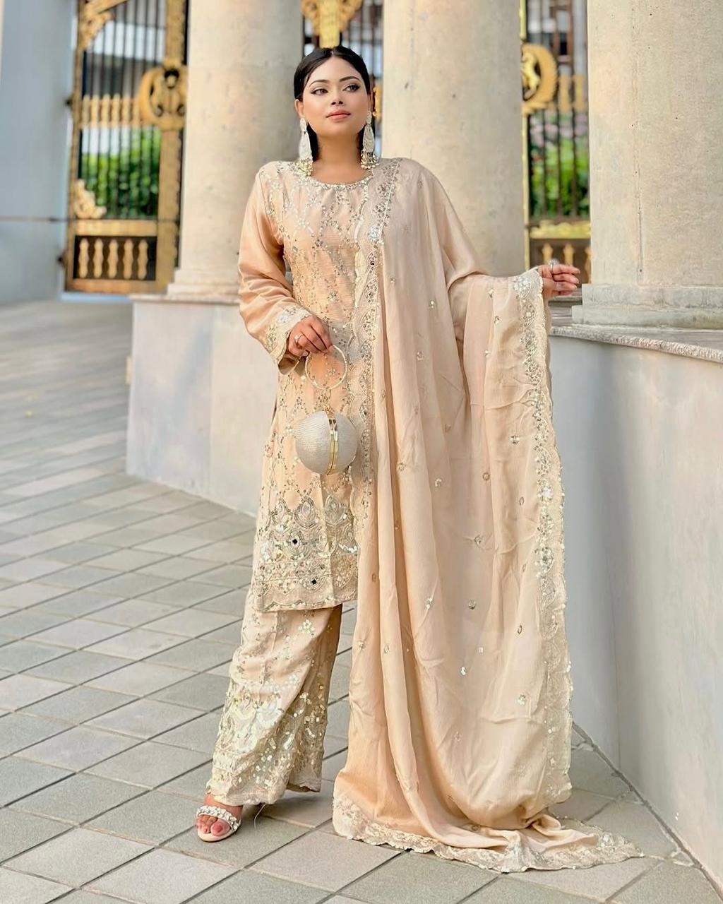• Work: Embroidery with sequence, real mirror handwork, and four-side lace border