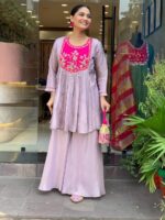 Elevate your ethnic wardrobe with this graceful lavender kurta set, designed with a perfect blend of elegance and comfort. The kurta features a beautifully crafted contrast magenta yoke, adorned with intricate floral embroidery, zari detailing, and delicate pearl tassels that add a rich festive touch.
