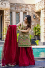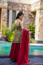 Step into a tale of regal elegance with our Ruby & Olive Embroidered Sharara Set. This exquisite ensemble is a masterpiece of traditional craftsmanship, designed for the modern woman who cherishes timeless beauty. The sleeveless olive green kurta is a canvas of intricate embroidery, depicting majestic palace windows (jharokhas) and graceful peacocks, rendered in vibrant, colorful threads.