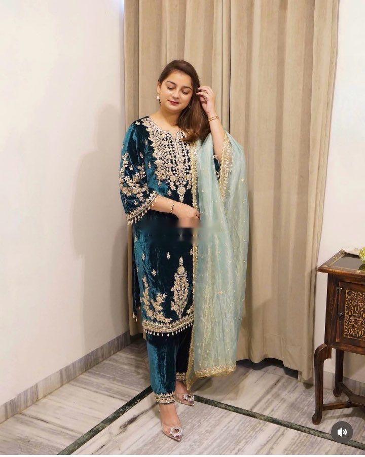 • Fabric: Pure viscose velvet top and pants with intricate embroidery and sequin work; micro cotton inner for comfort.