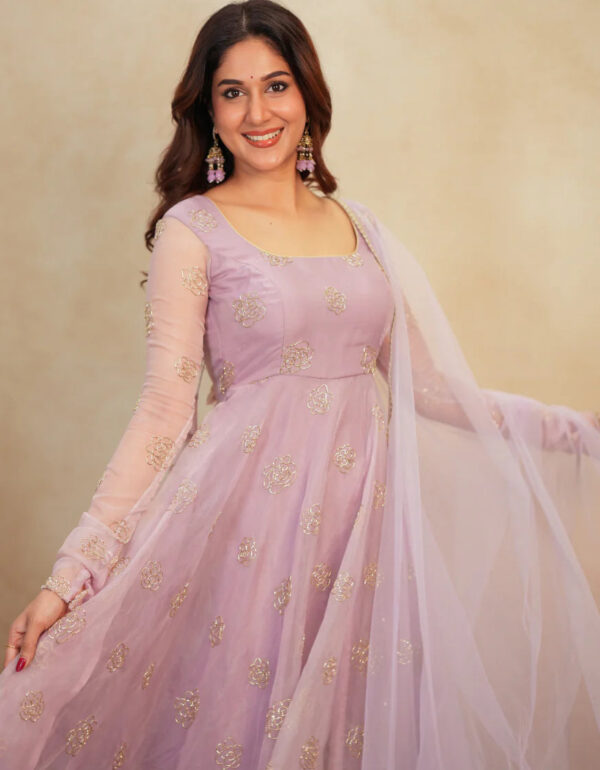 Anarkali:Organza Anarkali featuring all-over rose pattern work with full-gathered sleeves. Dupatta:Net dupatta detailed with a premium lace border Size &