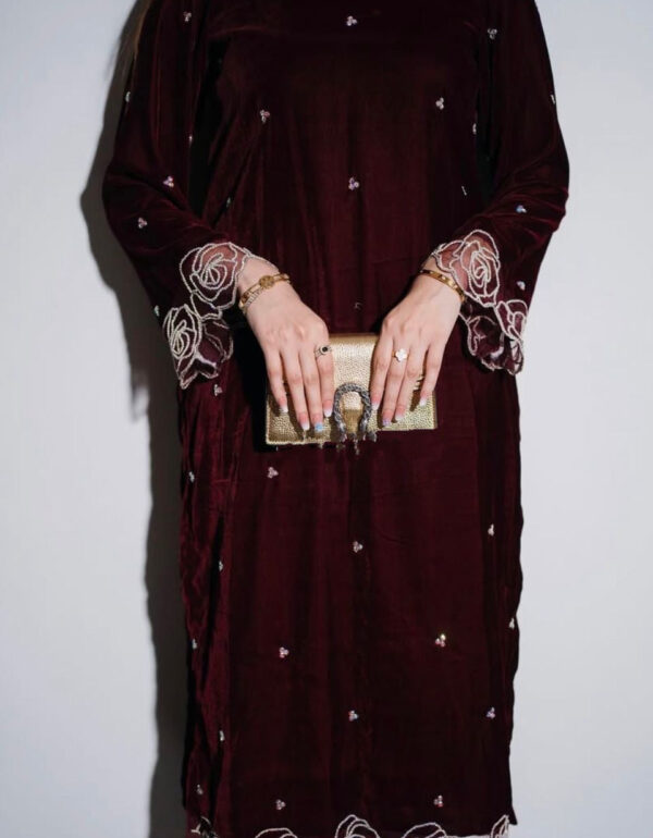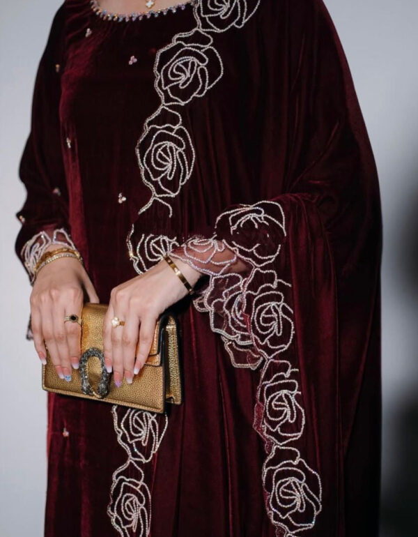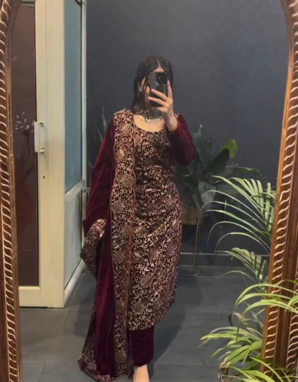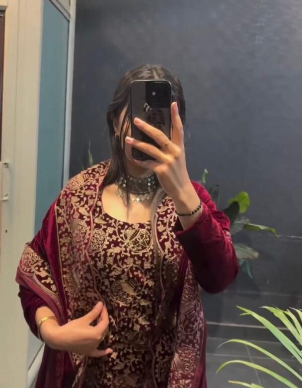 Fabric Details   Top • Fabric: Heavy Viscos Velvet with heavy embroidery work • Inner: Micro cotton • Length: 44–45