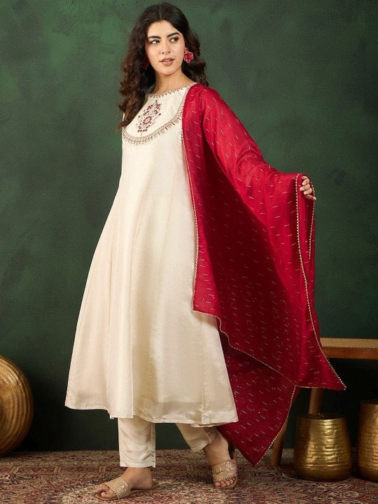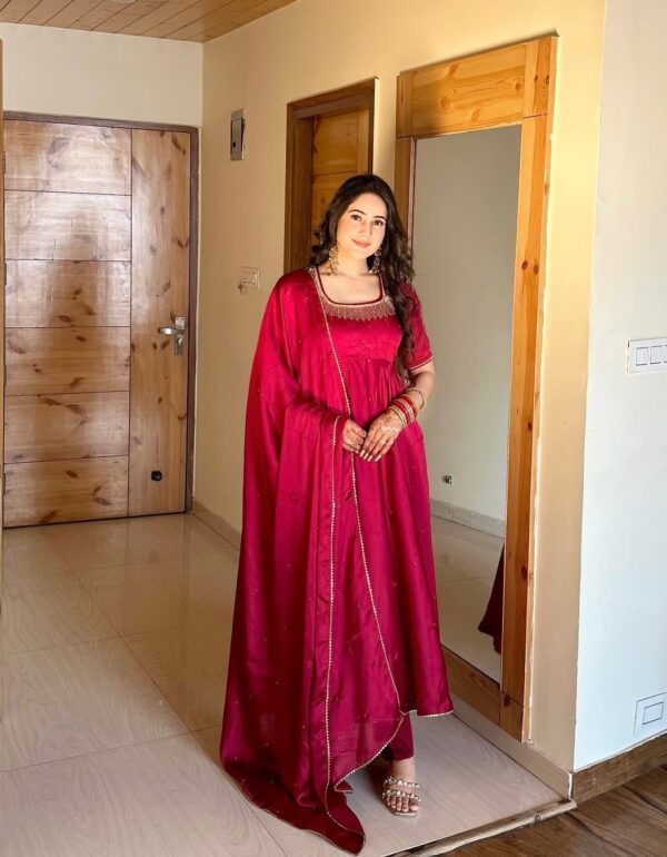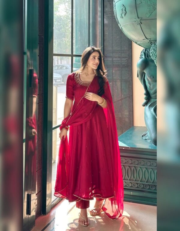 Radiate elegance and grace in our stunning Ruby Red Silk Anarkali Gown Set, a perfect choice for weddings, festive celebrations,