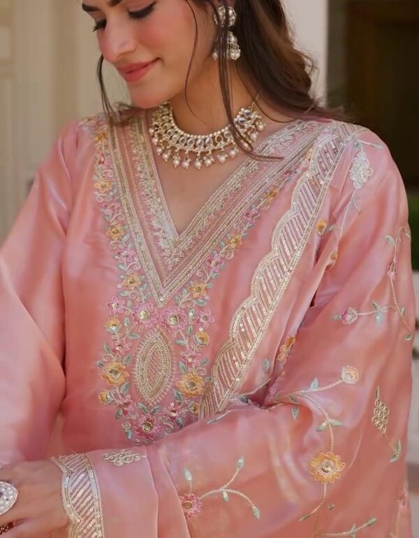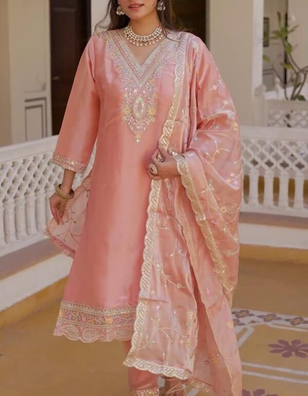 Top Fabric: Pure Vichitra with sequence coding embroidery work Bottom Fabric: Pure Vichitra Silk Dupatta Fabric: Pure Chanderi Jacquard Dupatta