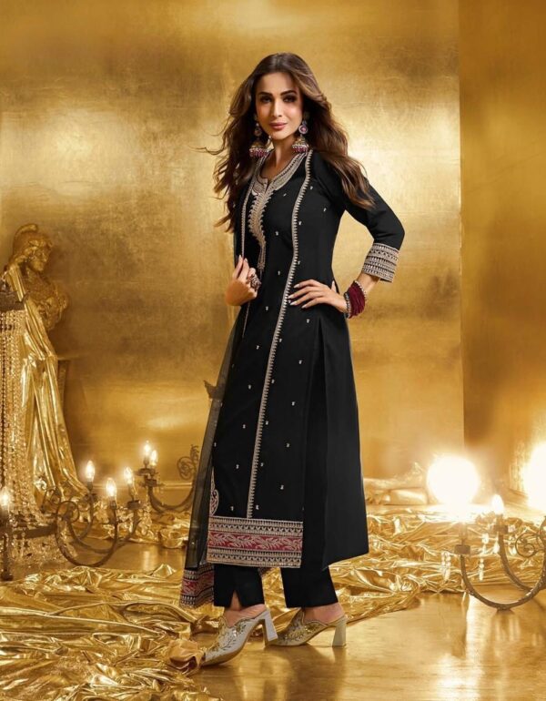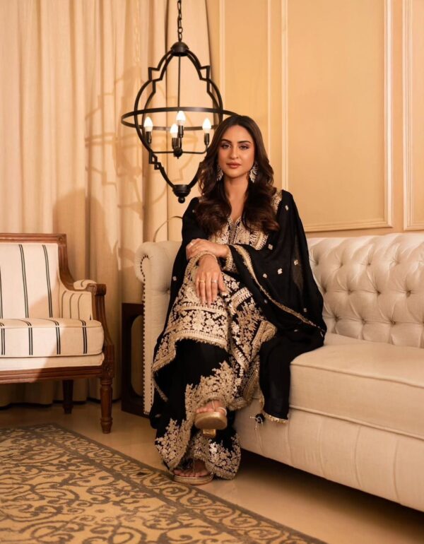 Step into a world of timeless sophistication with our Onyx Georgette Embroidered Suit Set. This exquisite black ensemble is a