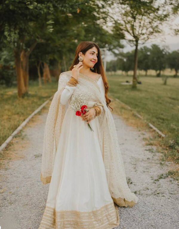 Gown Details Fabric: Chimmar Work: Heavy embroidery with fancy lace Flair: 3.5 meters Sleeve Length: 18 inches