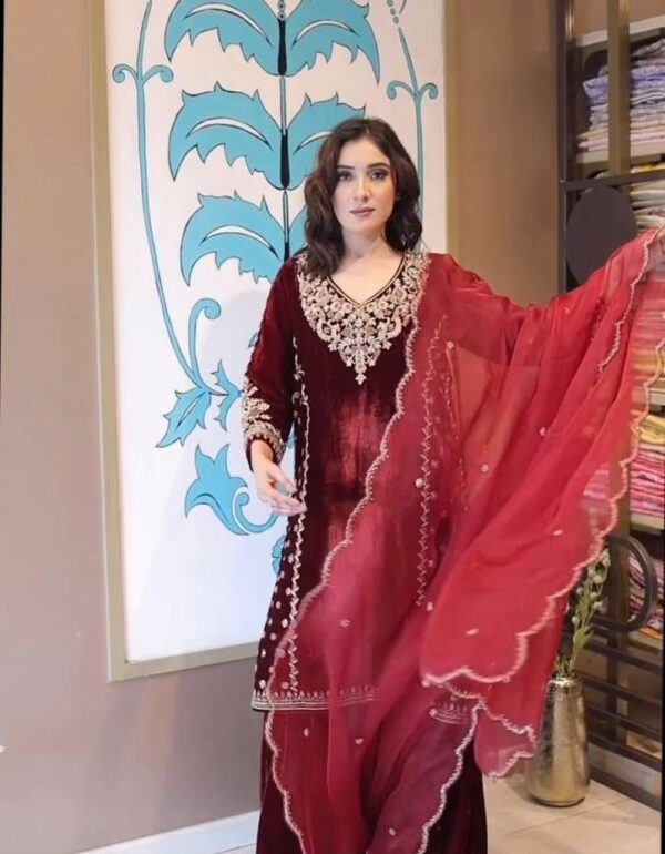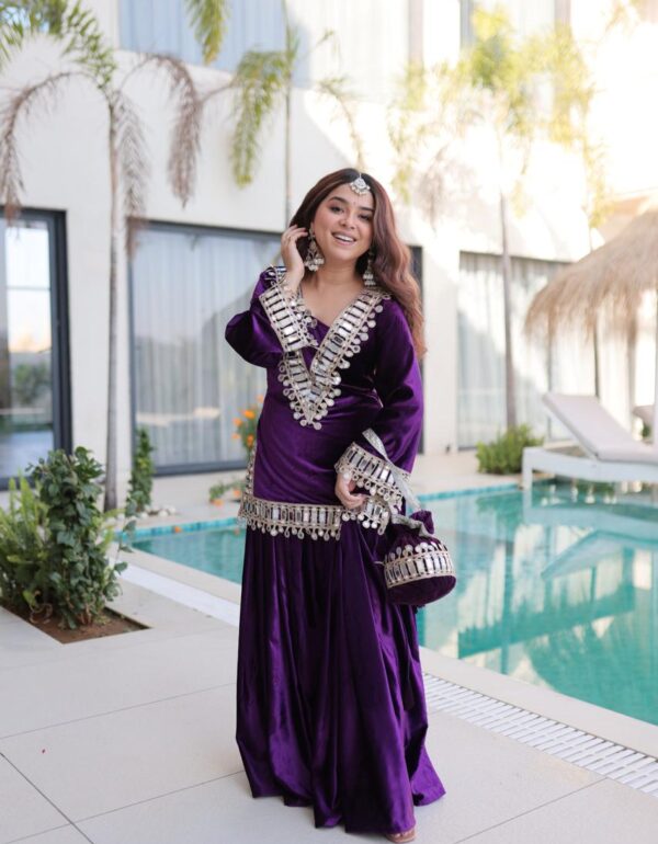 Fabric & Details * Top: Premium Ice Velvet adorned with intricate Zari embroidery and real mirror work. * Top Design: