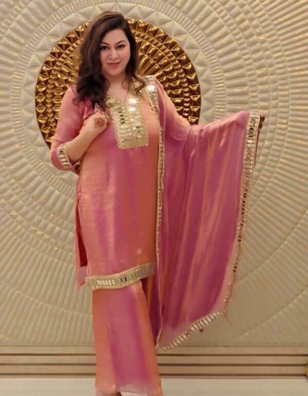 Top Details * Fabric: Tissue Silk * Work: Authentic real mirror work on the neckline and sleeves * Inner Lining:
