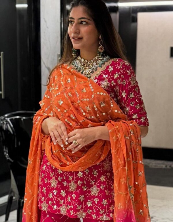 Embroidered Pink Sharara Suit with Orange Dupatta