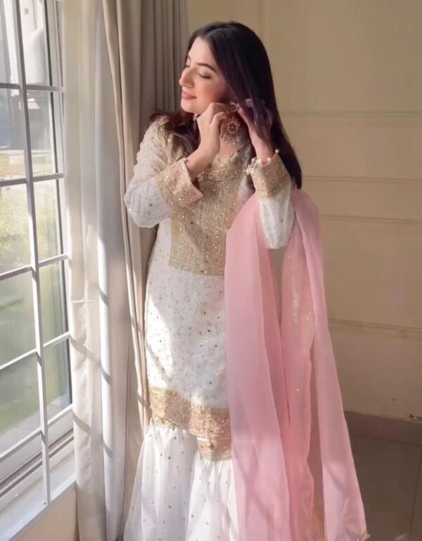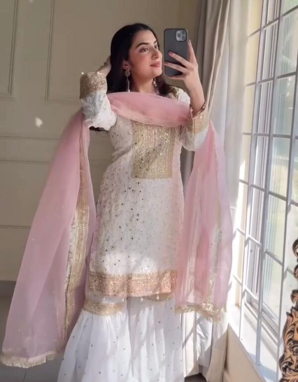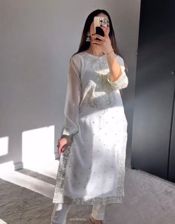 KURTI• Fabric: Premium Georgette• Work: Attractive Embroidery with Sequin and Thread Work (front side only)• Inner: Heavy Micro Cotton• Length: