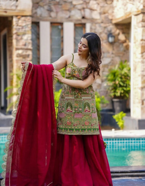 Step into a tale of regal elegance with our Ruby & Olive Embroidered Sharara Set. This exquisite ensemble is a
