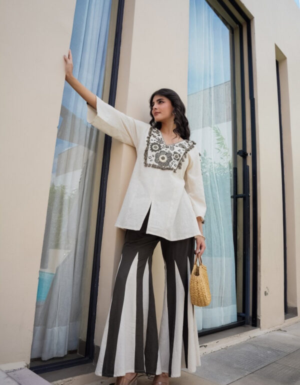 Monochrome Floral Embroidered Kurta with Contrast Flared Palazzo