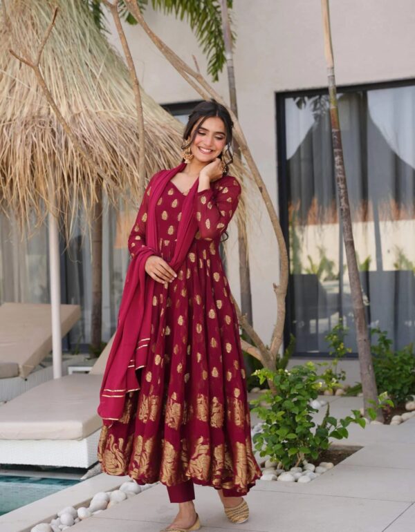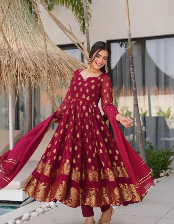 Kurta : Fabric – Viscos Georgette Kurta Length – 50-52” Front Neck – Fancy Back Neck – Fancy Sleeves –