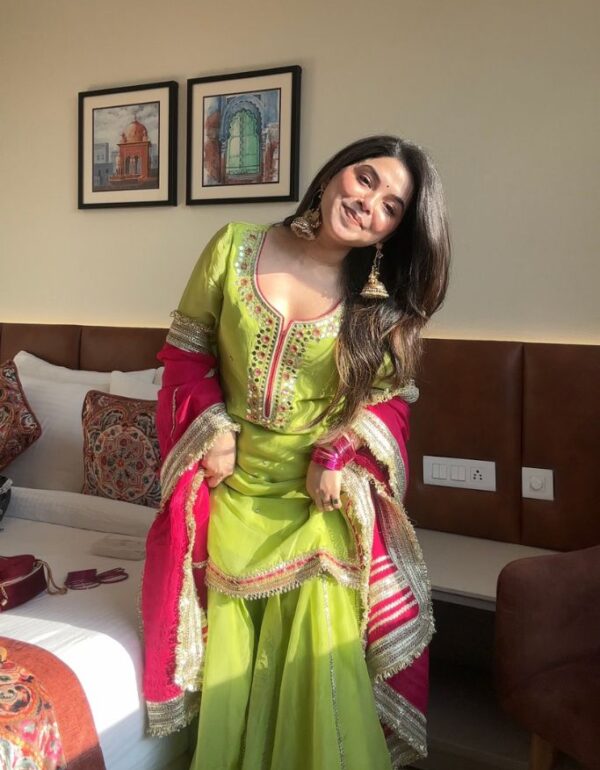 Step into a world of vibrant elegance with our Lime Green & Rani Pink Sharara Suit. This exquisite ensemble is