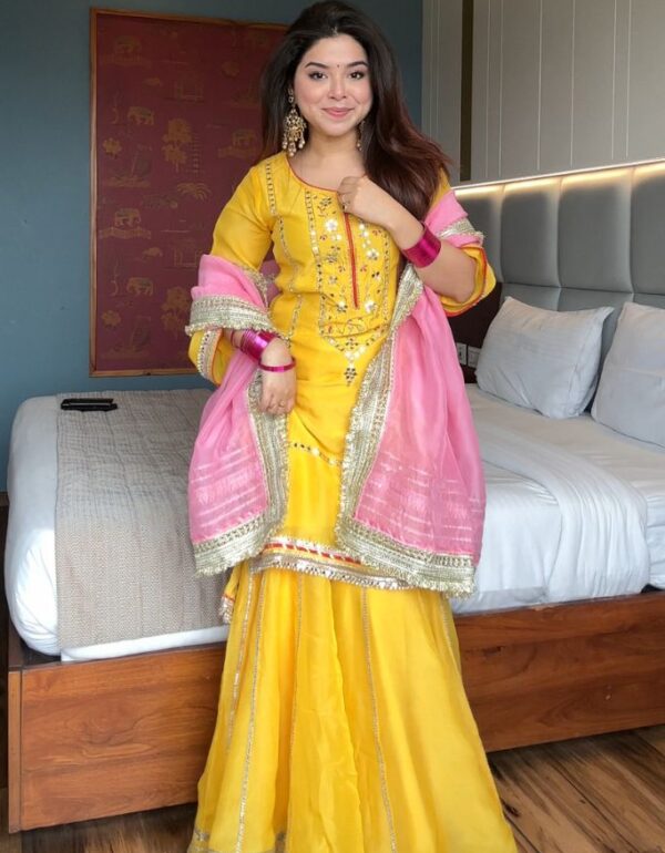 Step into the spotlight with our Sunshine Radiance Sharara Set, a masterpiece of traditional craftsmanship and contemporary elegance. This vibrant