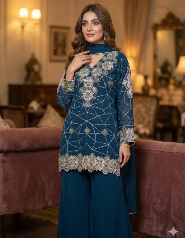 Women’s Teal Blue Geometric Embroidered Georgette Kurta Set with Palazzo & Dupatta – Heavy Thread Work Festive Party Wear